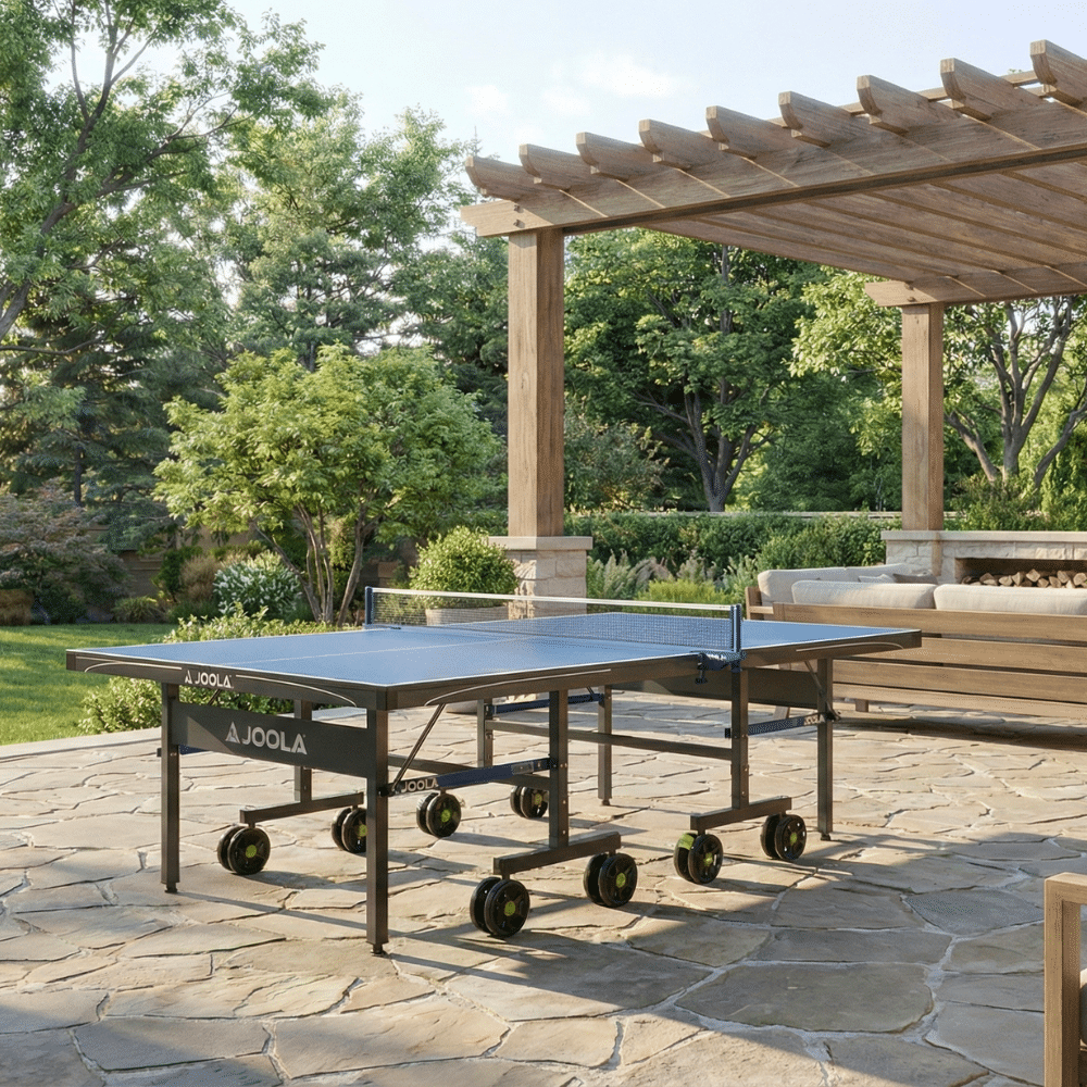 The JOOLA Nova Pro Plus Outdoor Table Tennis Table features a weather-resistant 6mm aluminum plastic composite surface designed for year-round outdoor-use. This table comes 95% pre-assembled. Simply attach the legs with 8 bolts and the table is ready for play in 10 minutes! Enjoy playing with friends or training solo by folding up one half of the table into the playback position. This is the perfect addition to your patio, backyard, or deck!