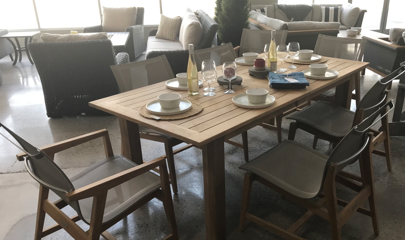 - Set includes 118″ Hyannis Dining Table, two (2) Marin Dining Armchairs and two (4) Marin Dining Sidechairs